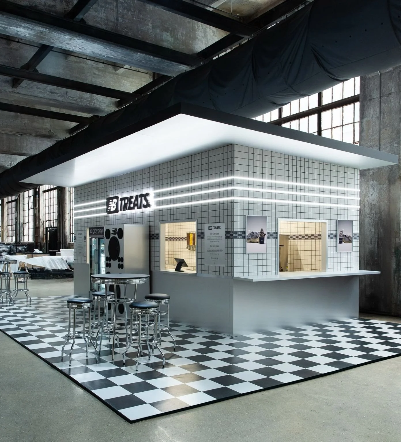 The heart of the activation was a diner-style pop up created with Kith Treats. Set against a backdrop of industrial architecture, the build was a sharp contrast: bright white tiles, glowing strip lights, and a black and white checkerboard floor. At first glance it felt like stepping into a retro American milkshake bar, but with every detail reimagined through the lens of New Balance grey.